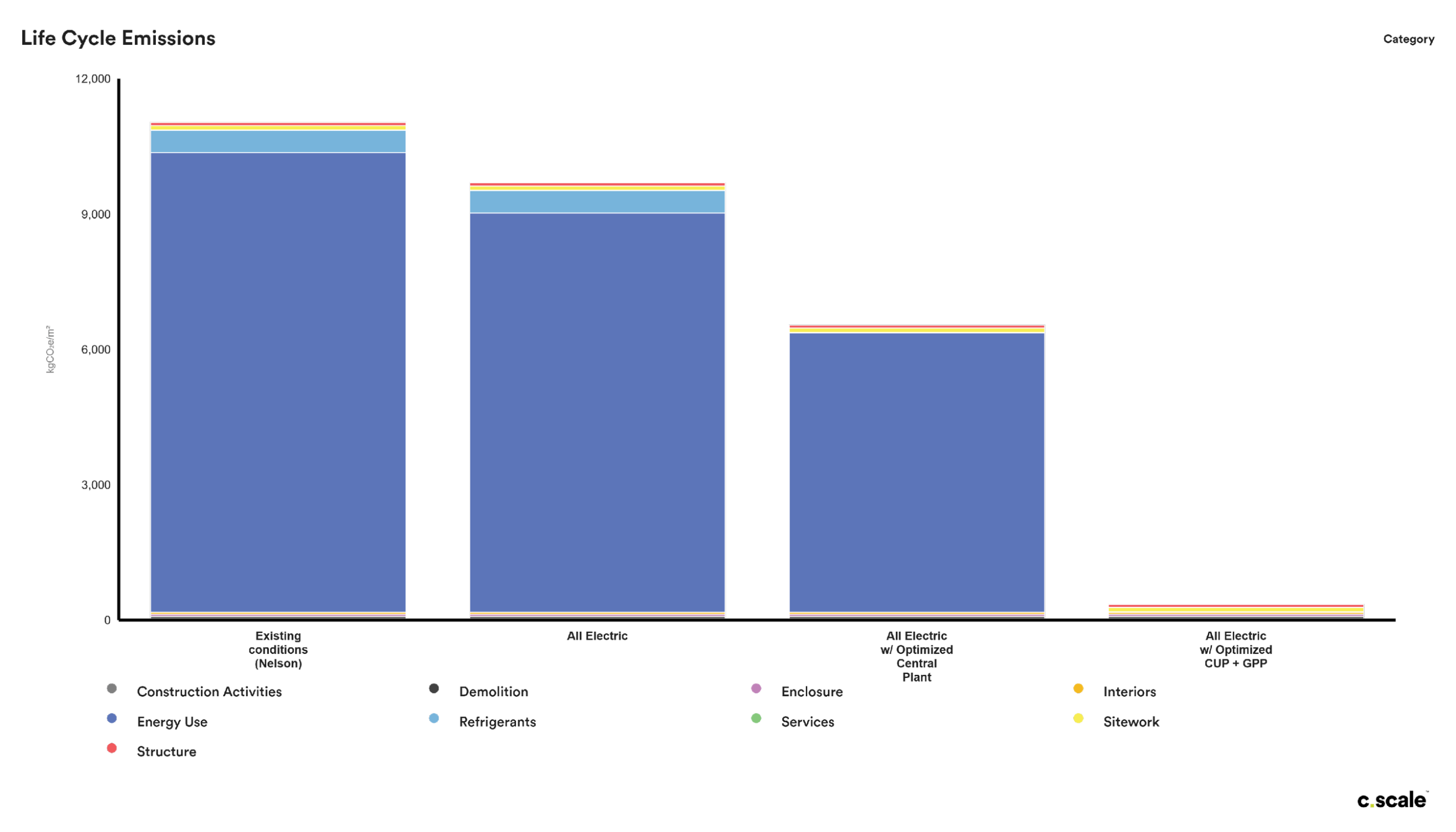 In the Nelson Atkins’ Nelson Building, a modest savings of 12% can be gained from switching from onsite fossil fuel burning (primarily for heating) to all-electric (See Figure 16 above). By optimizing the central plant, however, we can expect carbon savings ranging from 30% to as high as 75%. Modeled above is a moderate 30% savings. Regardless, if the Nelson chooses to offset with a green power purchase, then an impressive 96% of carbon is reduced.