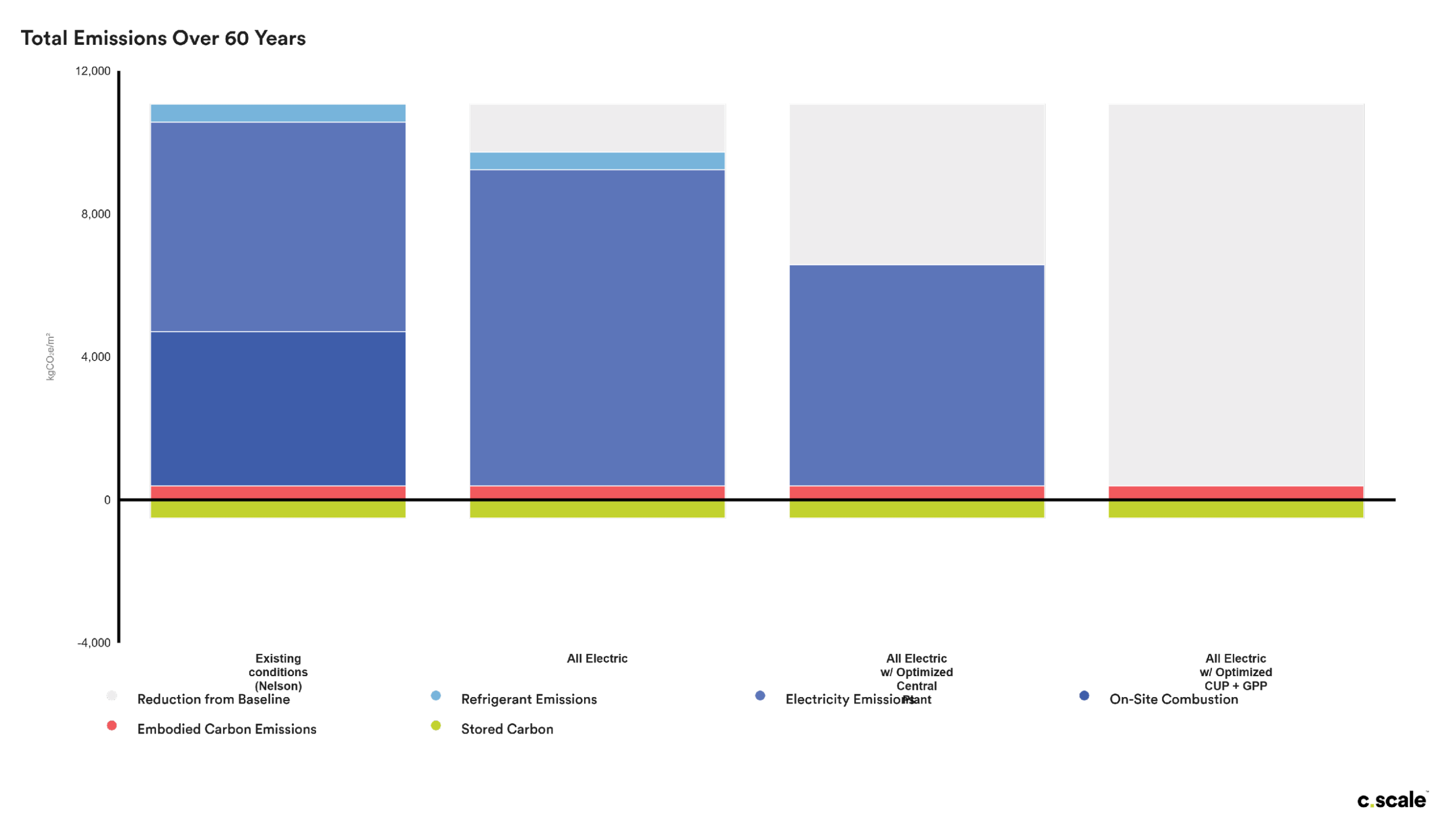 In addition to modeling energy, project analysts extended modeling to include carbon analysis over a 60-year life. The reductions included improvements in energy efficiency, not just building envelope, but also major revisions to the central utility plant. It also included runs for electrification, green power purchase from the utility, and environmentally friendly refrigerants.