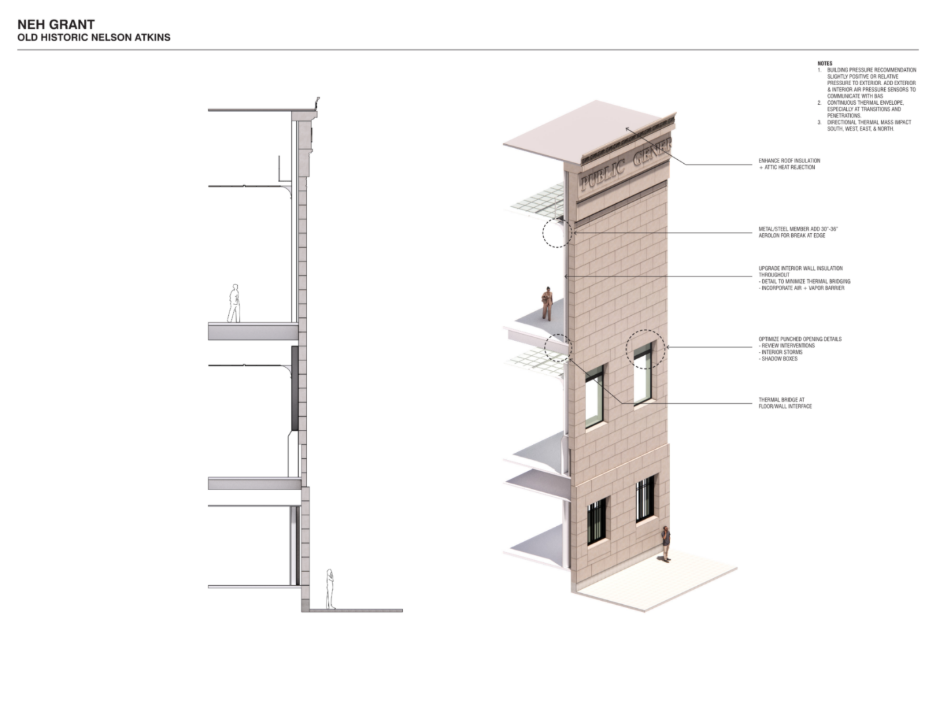 | Linda Hall Library (LHL) | EUI 76.0 kBtu/sf/yr | Roof performance improvements; curtain wall + glazing upgrades; opaque above-grade + foundation insulation | Yes — meaningful, especially as part of a package | Biggest envelope driver is curtain wall replacement (comfort, condensation control, peak loads). Arboretum sequestration becomes a major story once operational emissions are reduced. |