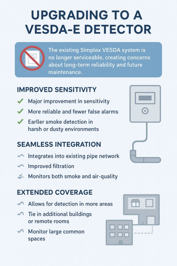 | **Add VESDA for collections protection** | Install an “early warning” air-sampling smoke detection system in key library/archival areas | Detects smoke **much earlier**, helping protect collections and reduce damage from fire or sprinkler activation |