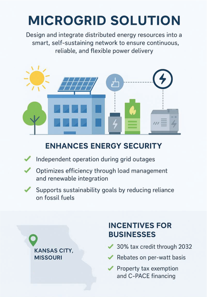 Businesses in Kansas City, Missouri can take advantage of a strong mix of federal, state, utility, and local incentives to reduce the cost of commercial solar projects. At the federal level, the Investment Tax Credit (ITC) provides a 30% tax credit on system costs through 2032, while MACRS accelerated depreciation allows businesses to recover much of the investment within the first few years. Missouri further supports solar adoption with a property tax exemption that excludes added system value from assessments and net metering through Evergy, which credits excess electricity generation back to utility bills. Evergy also offers rebates on a per-watt basis, helping reduce upfront installation costs. Kansas City bolsters adoption through the Kansas City Energy Project, which provides technical assistance, and streamlined permitting for solar systems. For financing, commercial property owners can use C-PACE (Commercial Property Assessed Clean Energy) to cover up to 100% of project costs with long-term, property-tax-based repayment, ensuring positive cash flow without upfront capital. Together, these grants, tax credits, rebates, and financing mechanisms create a comprehensive pathway for KCMO businesses to pursue sustainable, cost-effective solar energy.