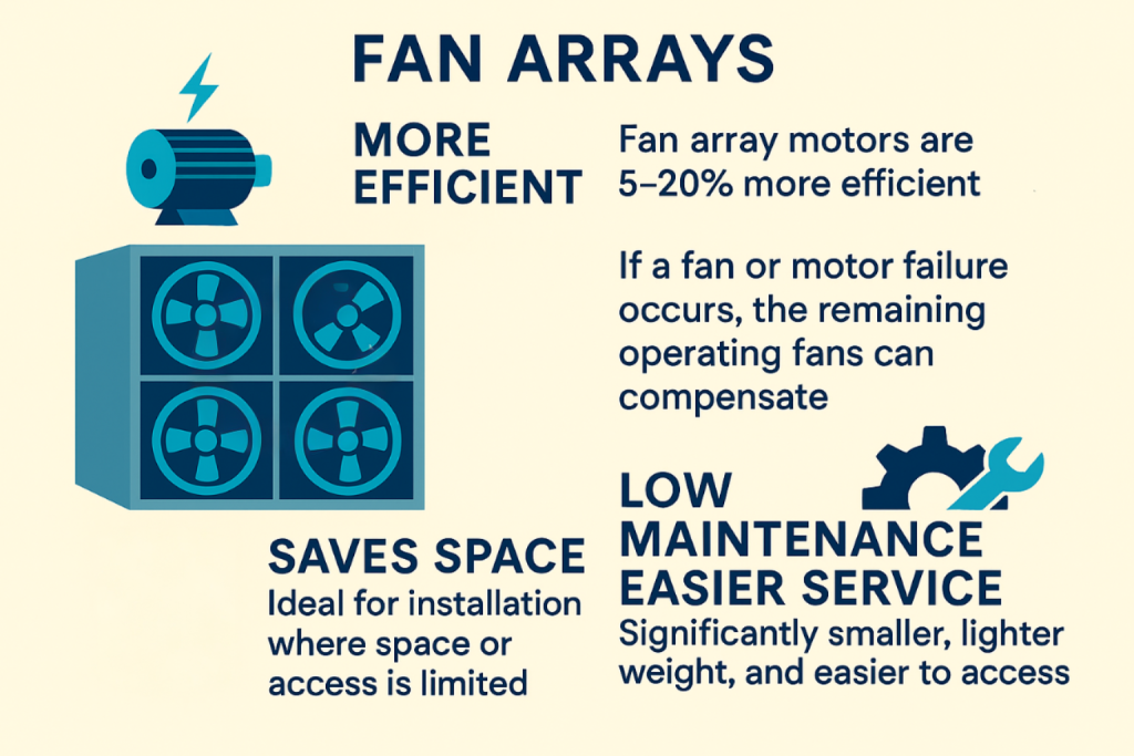 The energy required for distributing heating and cooling, heat rejection, and ventilation inside a commercial building accounts for roughly 25% of the energy consumed in the United States. [1] Out of that load, 50% of the energy consumed by supply fans. [2] Multiple smaller fan array systems will also provide redundancy and resilience, for if one fan’s motor fails; the rest of the fans will increase motor power until failed fan motor is fixed. This ensures the comfortability of occupants and decreasing degradation of equipment and objects stored within the institutions. When all fans are working, they operate part load, leading to higher energy savings due to HP reduction, via fan law. Updating or retrofitting units with will accumulate to energy savings. Additionally, the local utility company has a rebate program for retrofits and upgrades that each institution can take advantage of and have even higher savings.