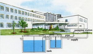 FIGURE 10 – Example of rainwater capture in commercial building. Tanks can be stored underground or in mechanical equipment rooms as necessary. [3]