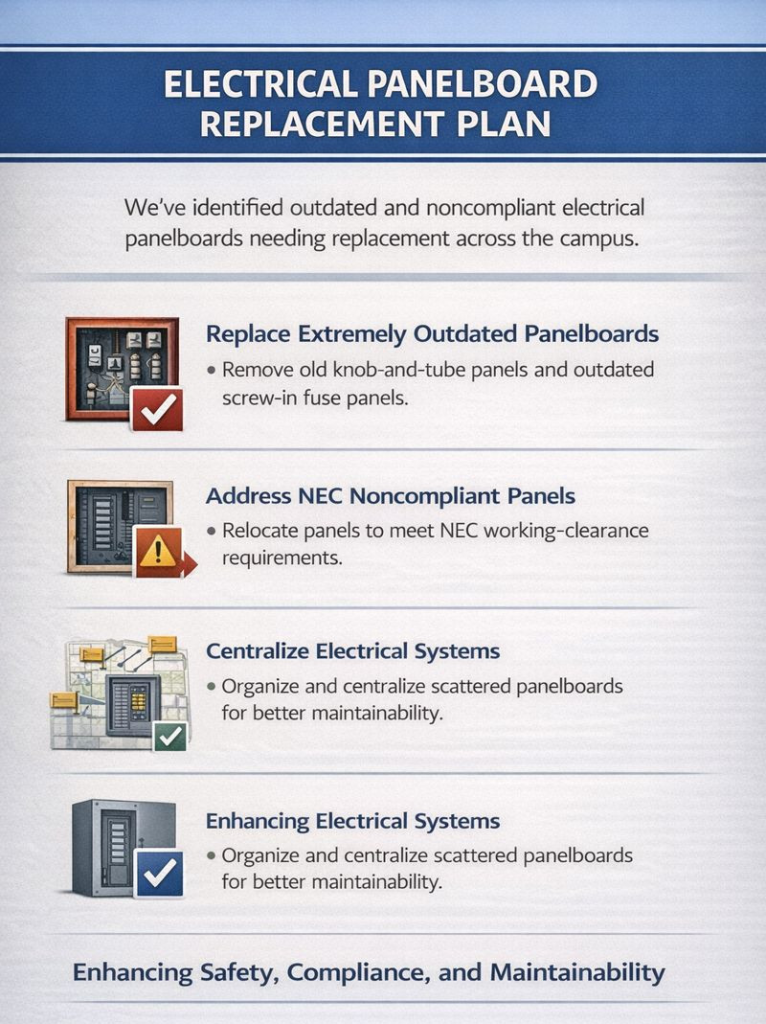 | **Electrical Panels & Distribution** | Routes power safely to different parts of the campus | Some panels are outdated, difficult to access, or no longer meet current standards | Modernized equipment improves safety, simplifies maintenance, and supports future growth |